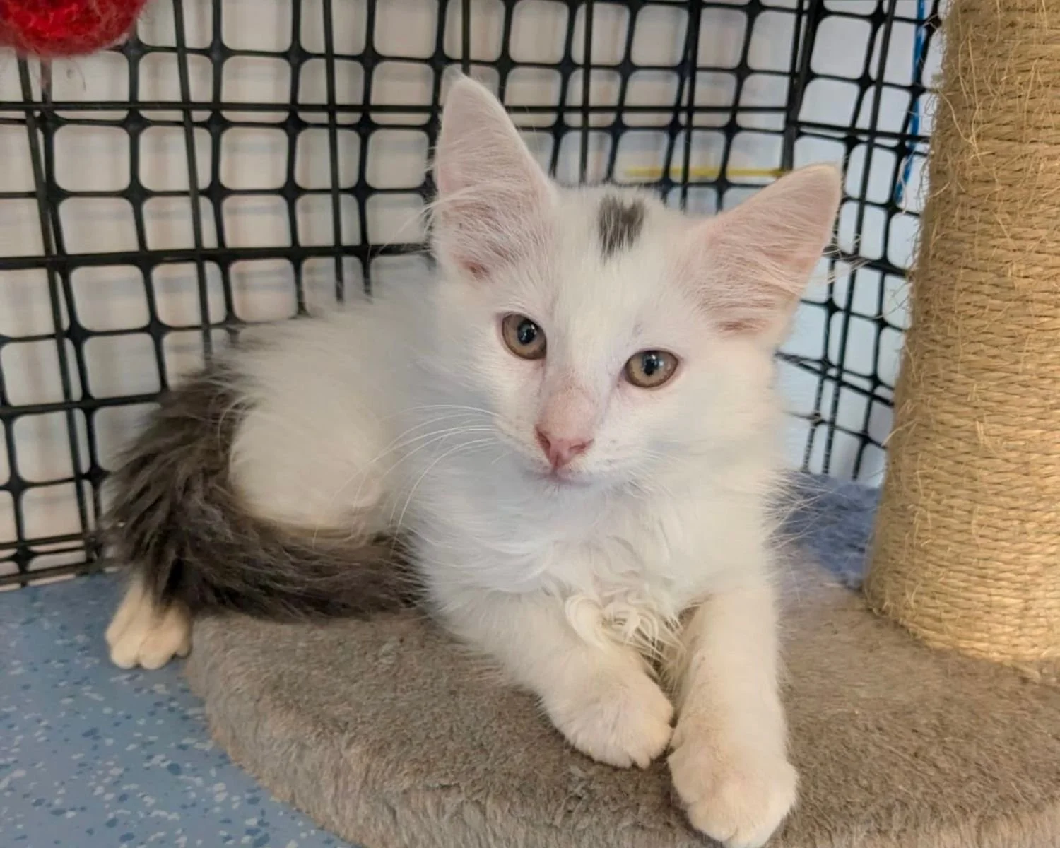 He has a beautifully expressive face, a soft presence, and a gentle heart. His unique white fur with just one grey patch on his head, and a grey tail make him all the more enchanting. Once he chooses you, he chooses you completely.